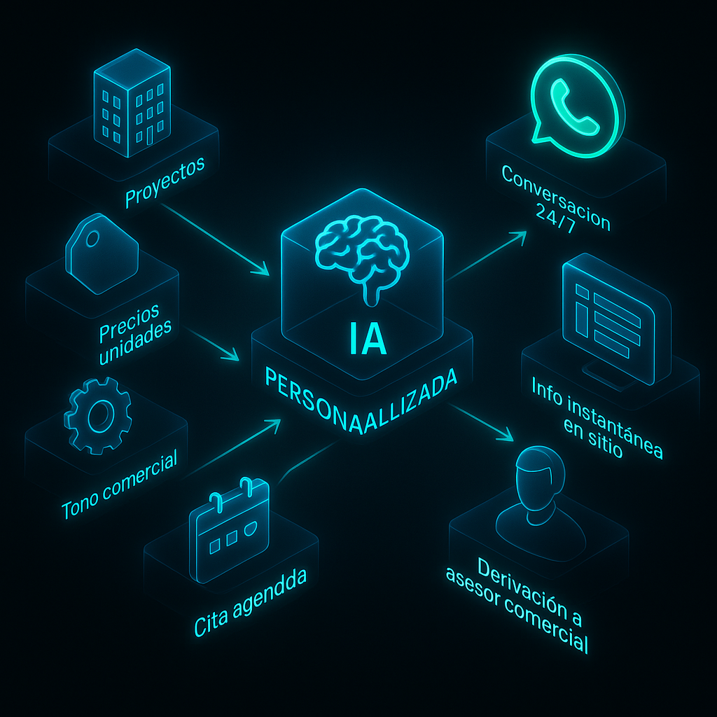 Diseñamos un sistema de IA conversacional entrenado en tus proyectos, tus precios, tus unidades y tu lenguaje comercial.
